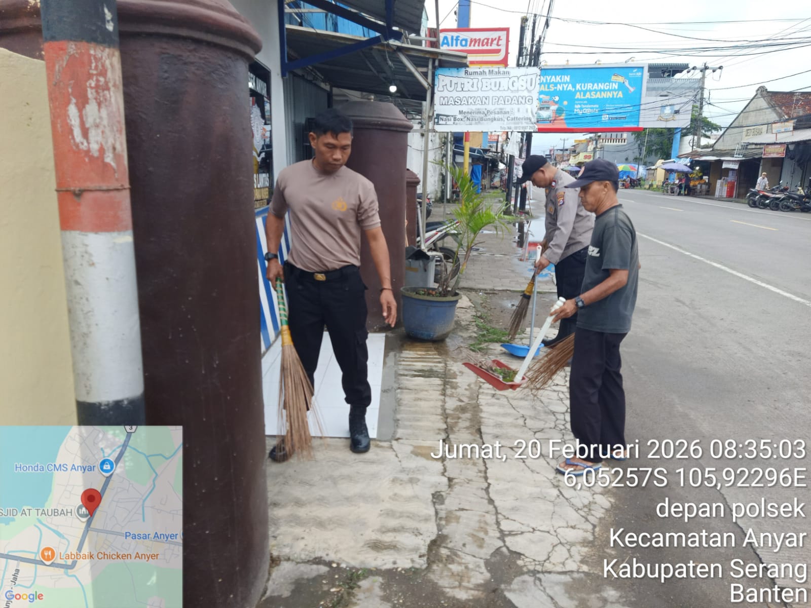 Anggota Polsek Anyar melaksanakan kegiatan Jumat Bersih di sekitar lingkungan Markas Komando (Mako) Polsek Anyar. Jumat (20/02/2026)Kegiatan tersebut dilaksanakan sebagai upaya menjaga kebersihan, kerapian, dan kenyamanan lingkungan kerja. Seluruh personel Polsek Anyar turut berpartisipasi dengan membersihkan halaman, ruang terbuka, serta saluran air di sekitar Mako.Melalui kegiatan korvei (Gotong Royong) ini...