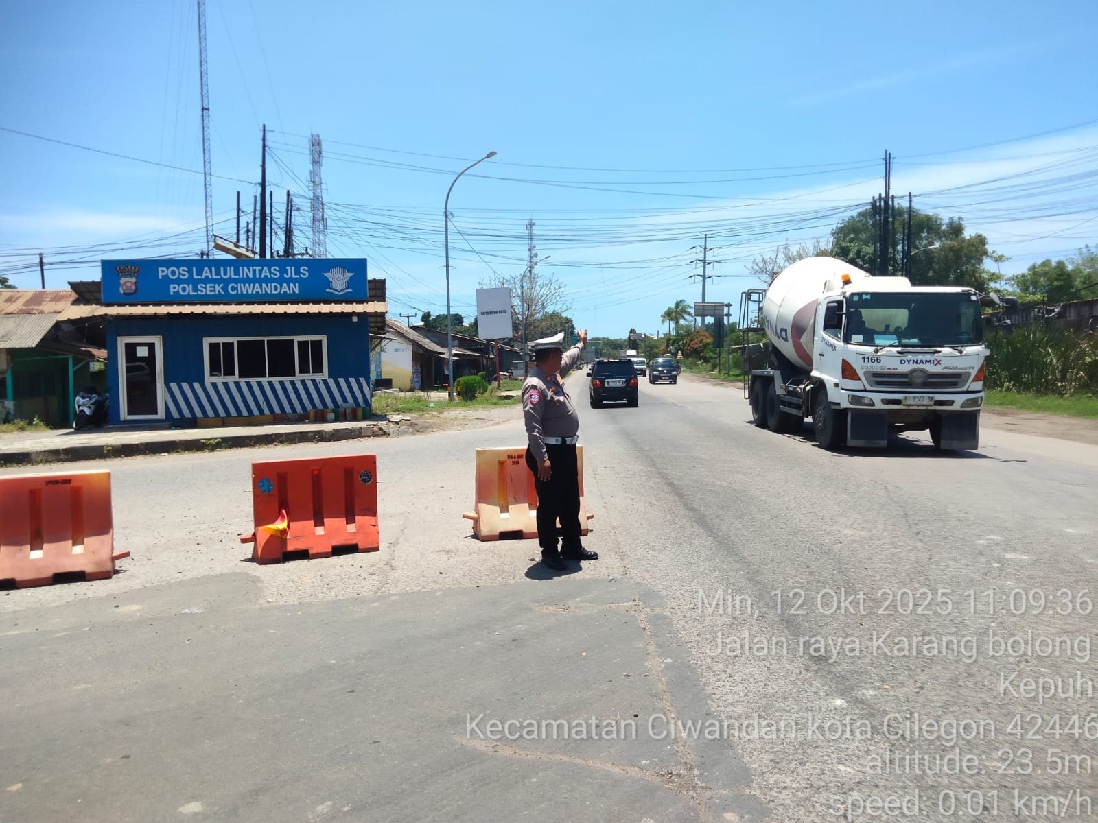 Cilegon - Personil Unit Lantas Polsek Ciwandan Polres Cilegon Polda Banten melaksanakan kegiatan monitoring jalur wisata di depan Pos Lantas JLS Ciwandan, Minggu, (12/10/2025).