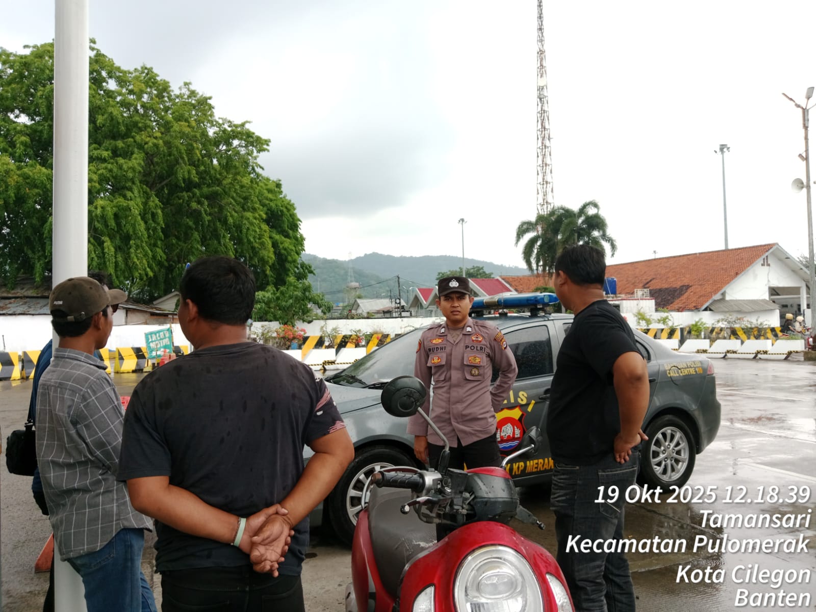 Cilegon - Personel Polsek Kskp Merak Polres Cilegon Polda Banten melaksanakan sambang dan patroli kawasan pelabuhan merak dalam rangka menjaga Harkamtibmas di Kawasan Pelabuhan Merak, Minggu (19/10/2025).