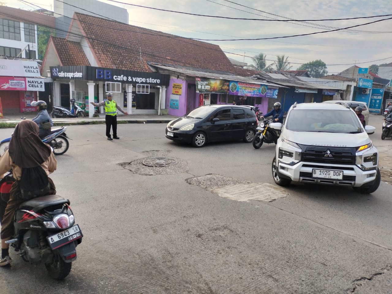 Unit Lantas Polsek Cilegon Polres Cilegon dan Dishub cilegon urai kemacetan lalin.