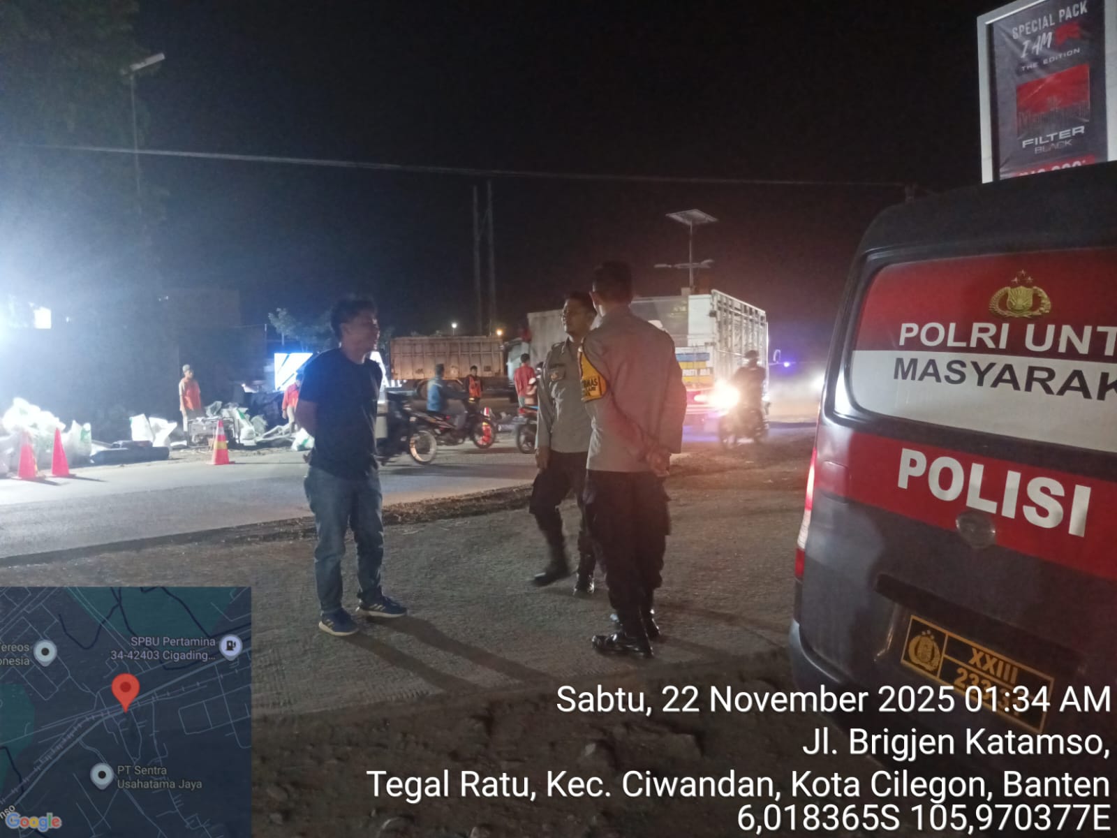Cilegon - Personil Polsek Ciwandan Polres Cilegon Polda Banten Selalu Melaksanaan Kegiatan KRYD (Kegiatan Rutin Yang Ditingkatkan) Patroli Rutin malam hari di daerah hukum Polsek Ciwandan Guna Persempit Ruang Pelaku Tindak Kejahatan, Sabtu (22/11/2025).