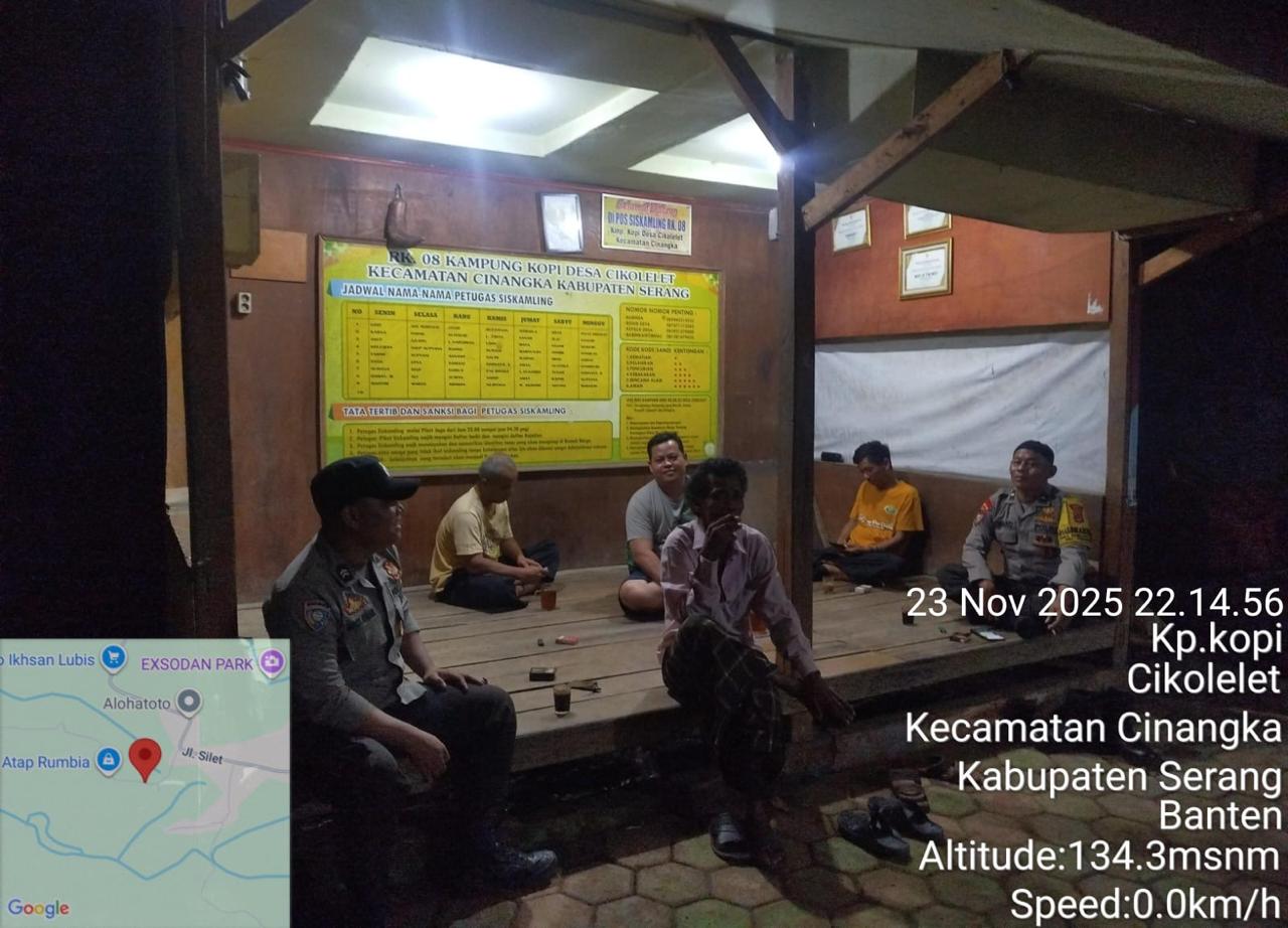 *Polres Cilegon* || Personil Bhabinkamtibmas Polsek Cinangka melaksanakan Program Komandan Wish Kapolda Banten RONDA SATKAMLING menyampaikan komunikasi dengan Petugas Siskamling agar berperan aktif dalam menciptakan Harkamtibmas yang aman dan Kondusif, Senin (24/11/2025).