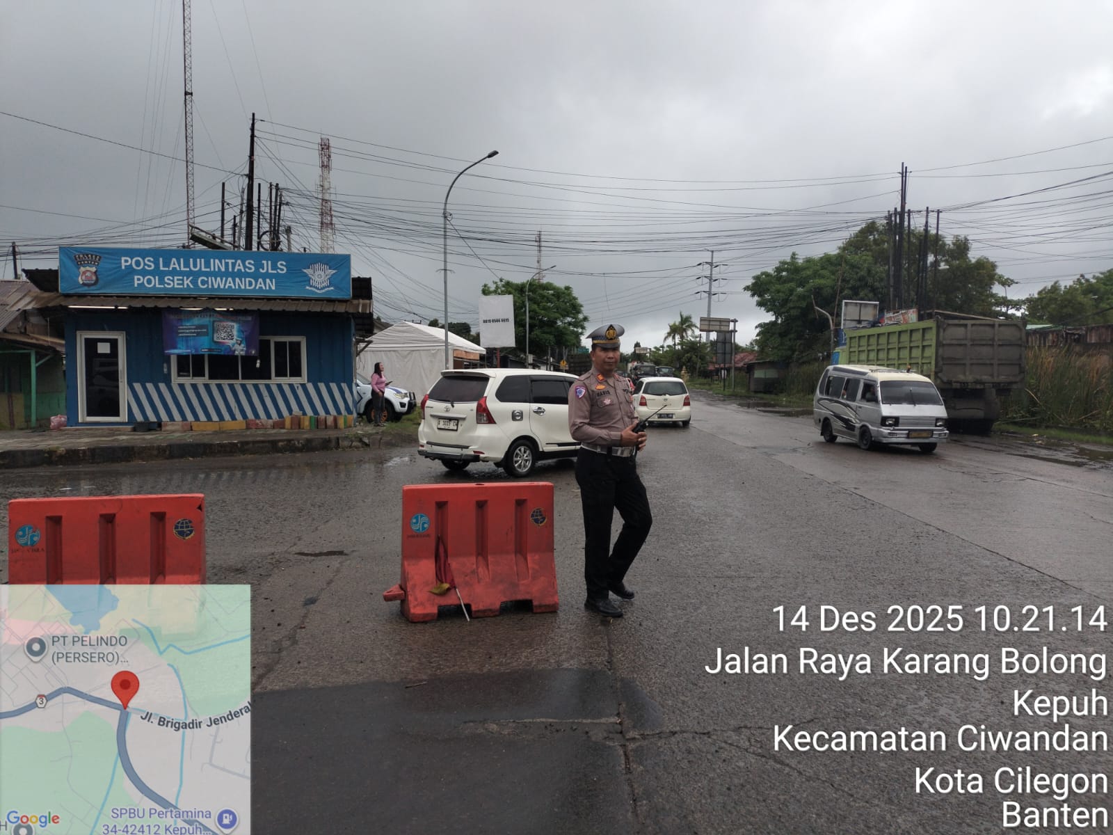 Cilegon - Personil Unit Lantas Polsek Ciwandan Polres Cilegon Polda Banten melaksanakan kegiatan monitoring jalur wisata di depan Pos Lantas JLS Ciwandan, Minggu (14/12/2025).