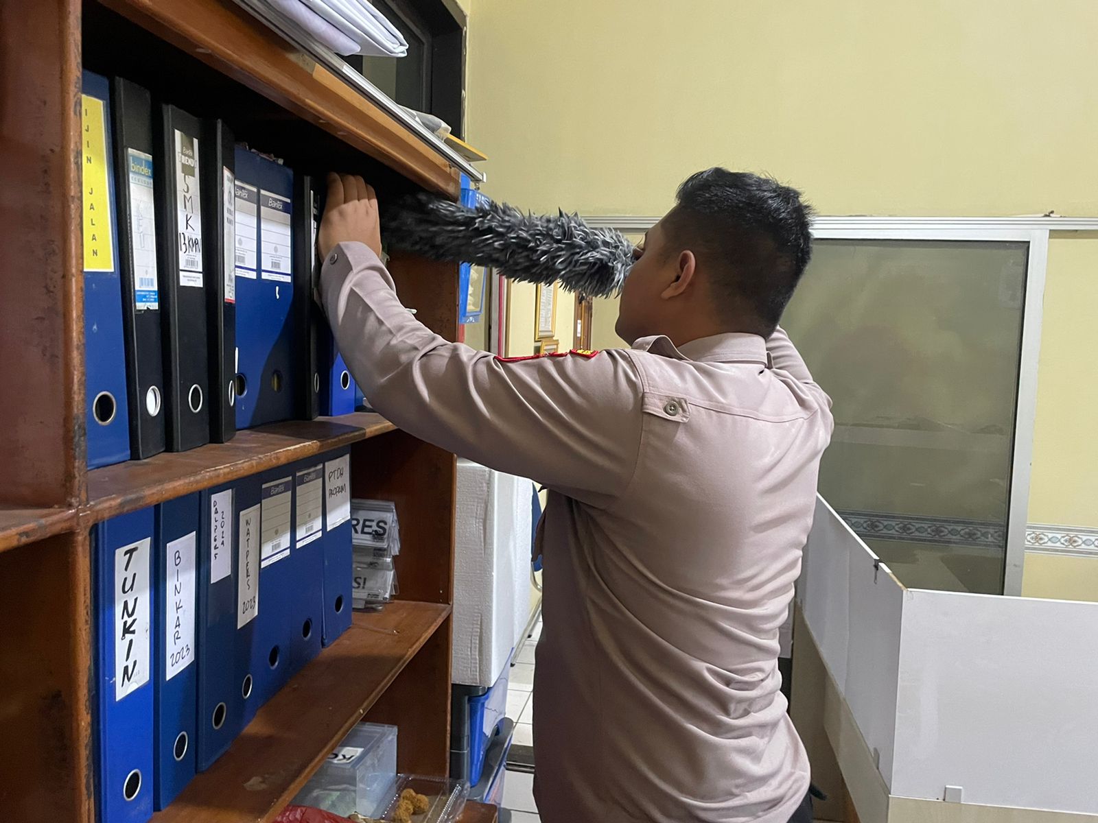 anggota SDM Polres Cilegon, dalam Pelaksanaan meenjaga kebersihan ruangan kerja setiap saat.
