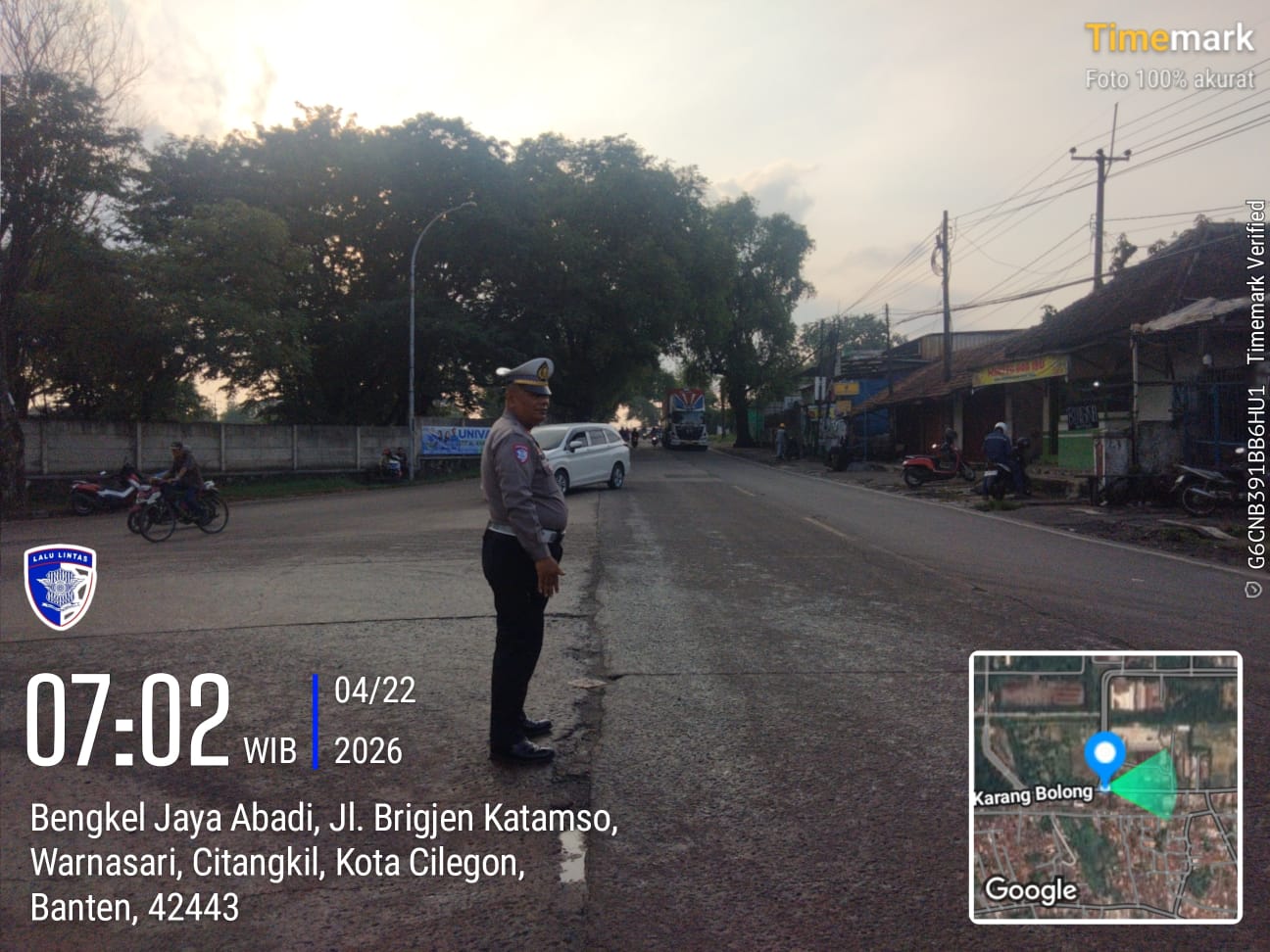 Cilegon - Pelayanan Prima Kepolisian Kepada Warga Masyarakat dan Guna menciptakan situasi lalu lintas yang aman, tertib dan lancar, Personel Unit Lantas Polsek Ciwandan Polres Cilegon Polda Banten secara rutin melaksanakan pengaturan lalu lintas, Rabu (22/04/2026).
